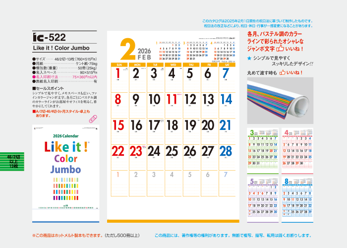 シンプルで見やすく、メモスペースも広い、ファインカラージャンボ文字。各月ごとにパステル調のカラーラインがお部屋やオフィスを明るく、華やかにしてくれます。