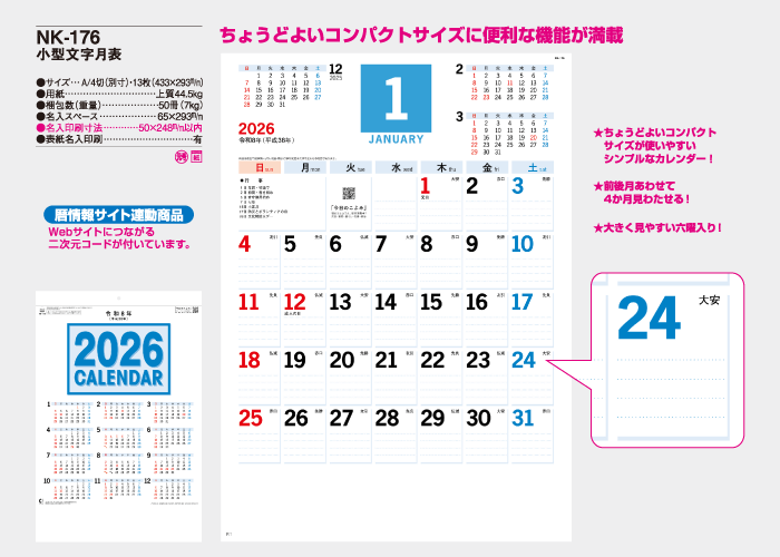 ちょうどよいコンパクトサイズが使いやすいシンプルなカレンダー!