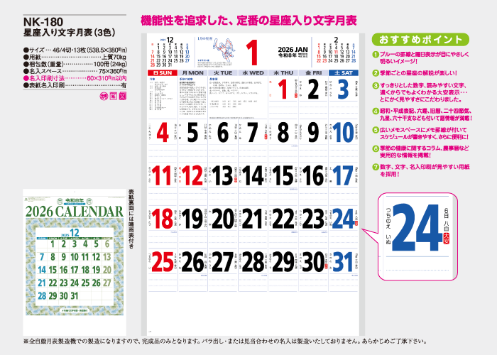 ※全自動月表製造機での製造になりますので、完成品のみとなります。バラ出し・または見当合わせの名入れは製造いたしておりません。あらかじめご了承ください。