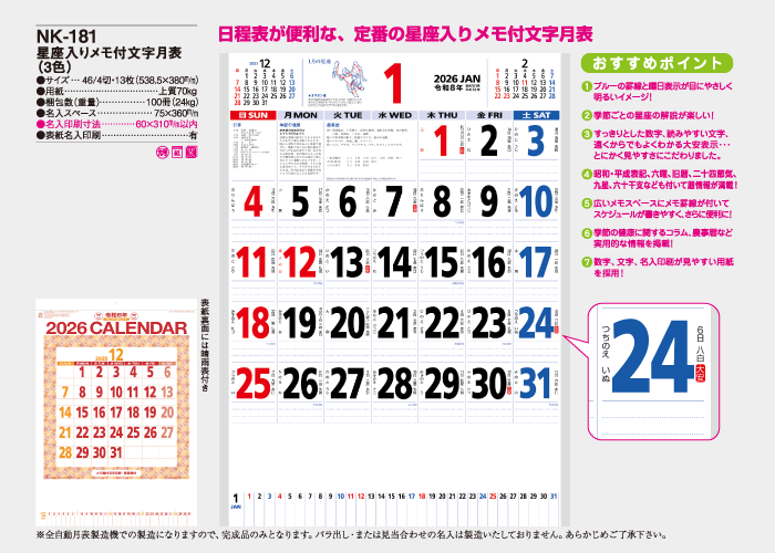 ※全自動月表製造機での製造になりますので、完成品のみとなります。バラ出し・または見当合わせの名入れは製造いたしておりません。あらかじめご了承ください。