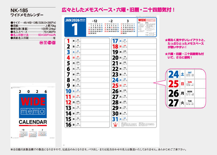 ※全自動月表製造機での製造になりますので、完成品のみとなります。バラ出し・または見当合わせの名入れは製造いたしておりません。あらかじめご了承ください。