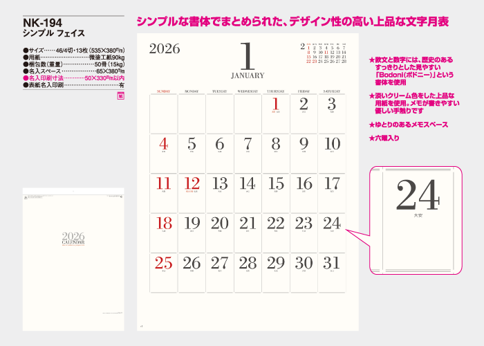 シンプルな書体でまとめられた、デザイン性の高い上品な文字月表