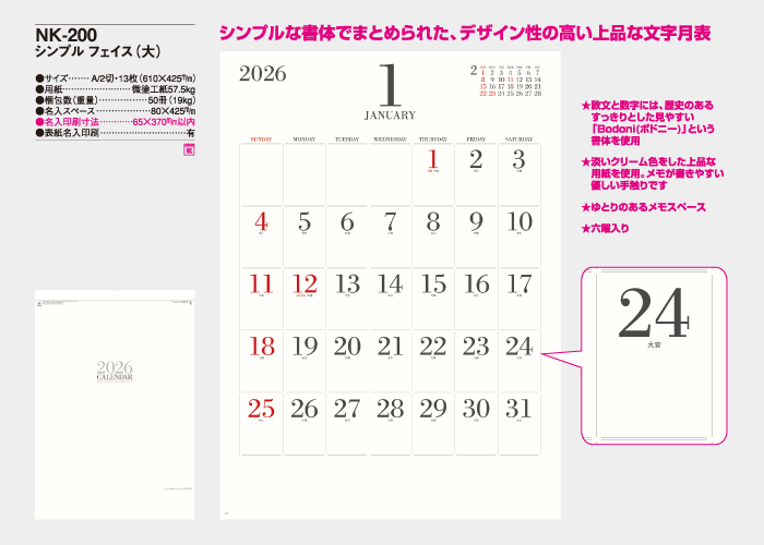 シンプルな書体でまとめられた、デザイン性の高い上品な文字月表