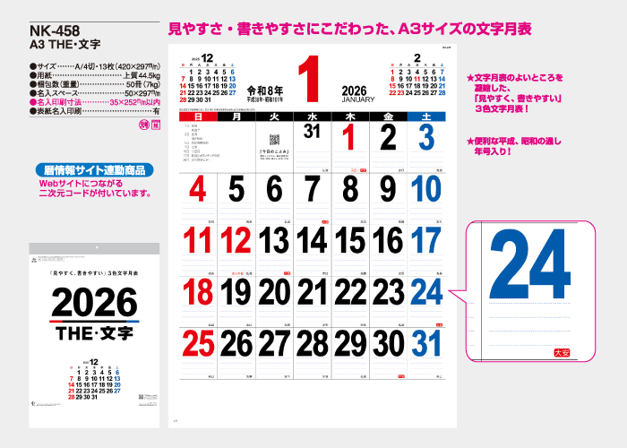 見やすさ・書きやすさにこだわった、A3サイズの文字月表