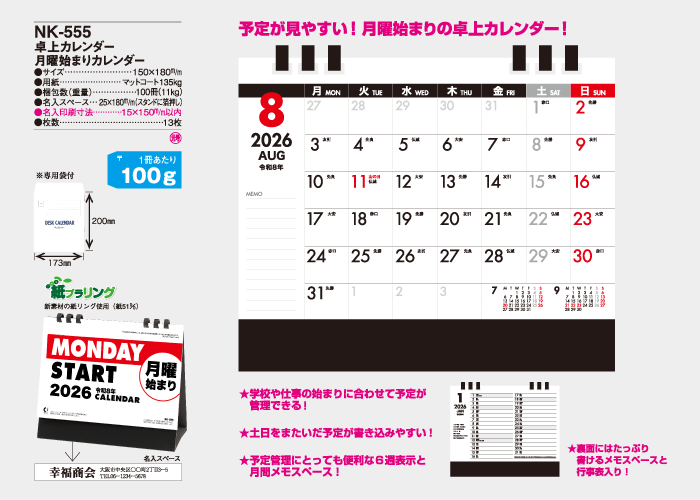 予定が見やすい!月曜始まりの卓上カレンダー!