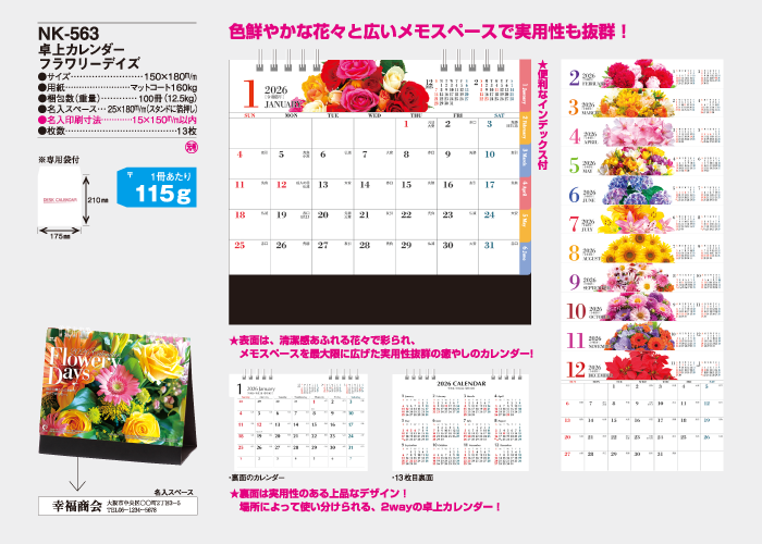 表面は、清潔感あふれる花々で彩られ、メモスペースを最大限に広げた実用性抜群の癒しのカレンダー!