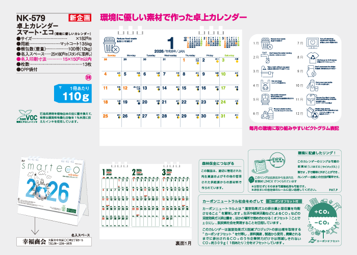 このカレンダーは、温室効果ガス削減プロジェうとの排出権を取得する”カーボンオフセット”を付帯し、原料調達、製造から使用、廃棄されるまでに排出されるCO2のうち企業努力だけでは削減しきれないCO2約309g(1冊あたり)分をオフセットしています。