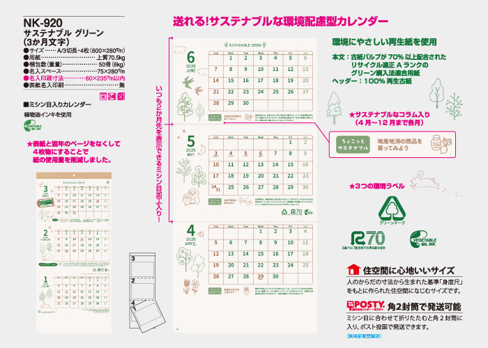 表紙と翌年のページをなくして4枚物にすることで紙の使用量を削減しました。