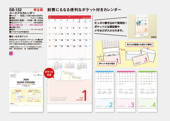 便利なポケット付きカレンダーに、メモ欄を多めにとったシンプルなカレンダーが新登場。ポケット部分を切り取ると封筒にもなります。