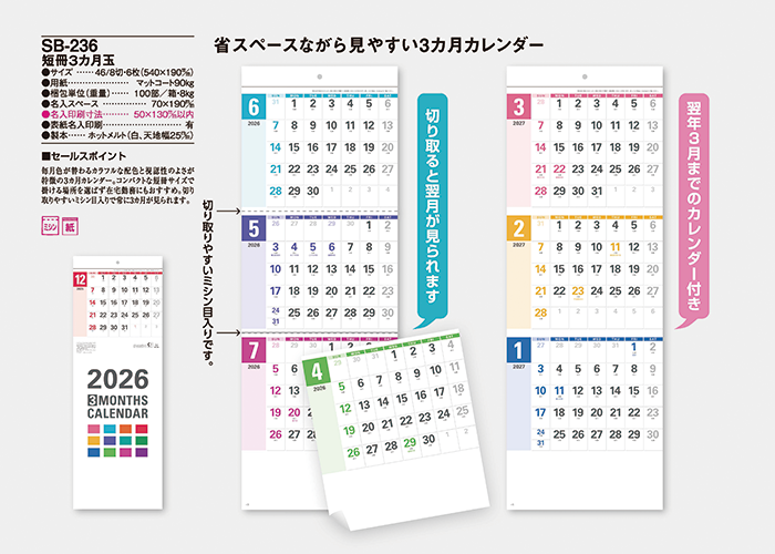 毎月色が替わるカラフルな配色と視認性のよさが特徴の3ヵ月カレンダー。コンパクトな短冊サイズで掛ける場所を選ばず在宅勤務にもおすすめ。切り取りやすいミシン目入りで常に3カ月が見られます。