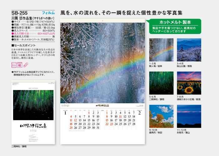 日本の四季を表現した川隅功先生の作品を厳選、フィルムにグラビア印刷した色彩美が引き立つ高級大型カレンダー。やすらぎの時を演出し、贈答に最適。