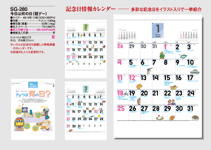 いろんな記念日を掲載した情報満載のカレンダーです。