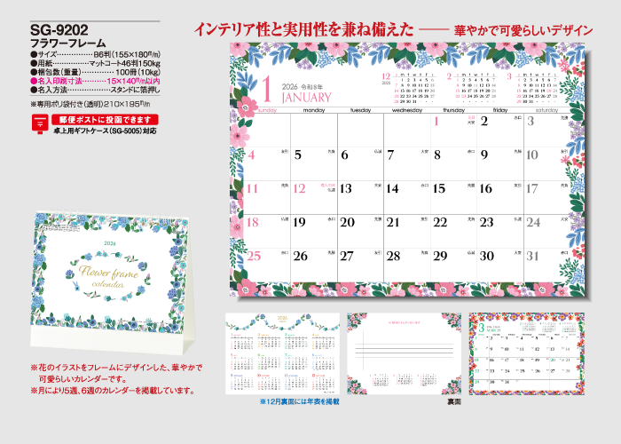 花のイラストをフレームにデザインした、華やかで可愛らしいカレンダーです。